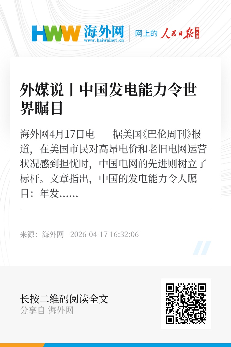 海外网4月17日电 据美国《巴伦周刊》报道,在美国市民对高昂电价和老旧电网运营状况感到担忧时,中国电网的先进则树立了标杆。