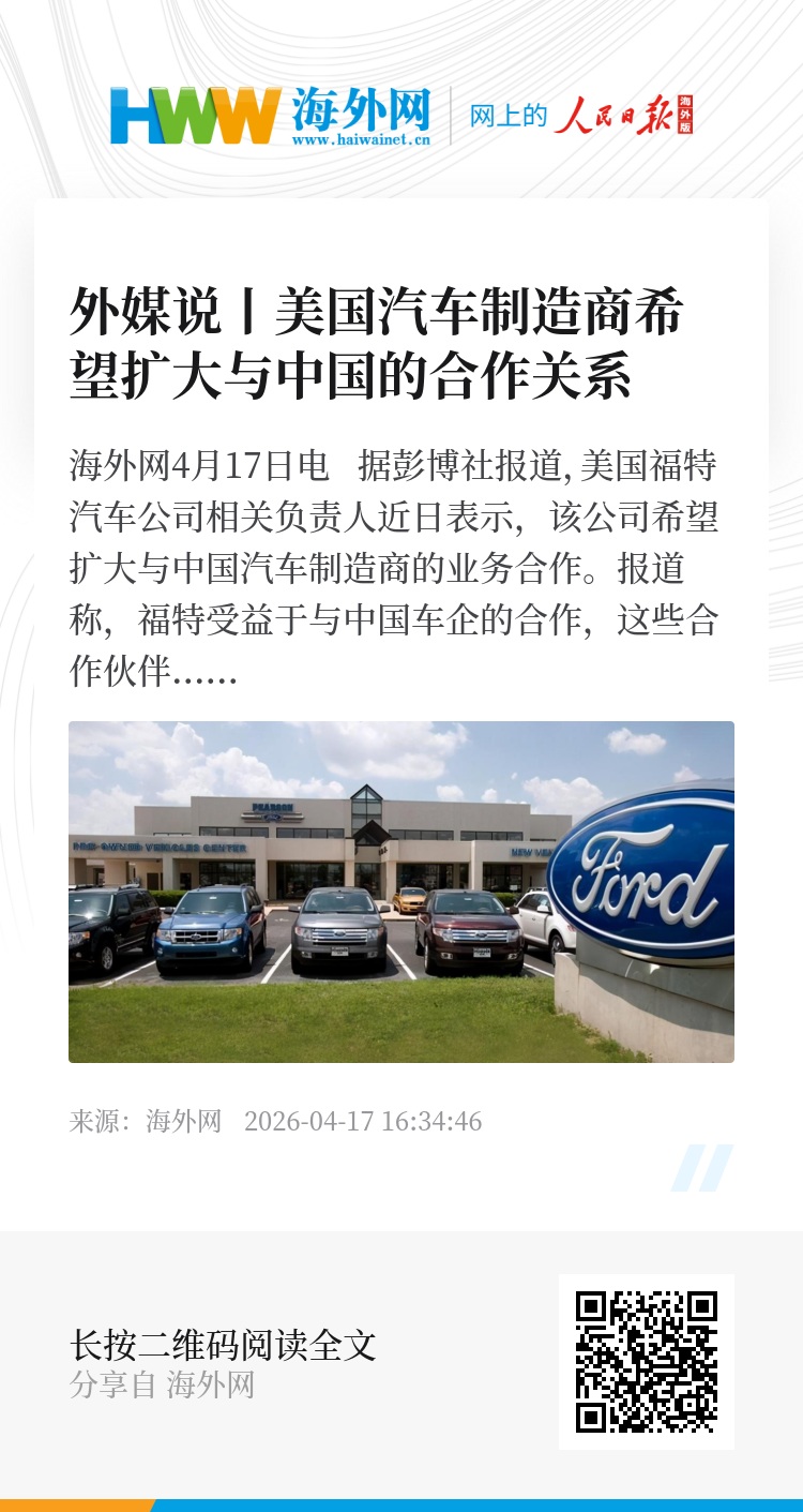 海外网4月17日电 据彭博社报道,美国福特汽车公司相关负责人近日表示,该公司希望扩大与中国汽车制造商的业务合作。
