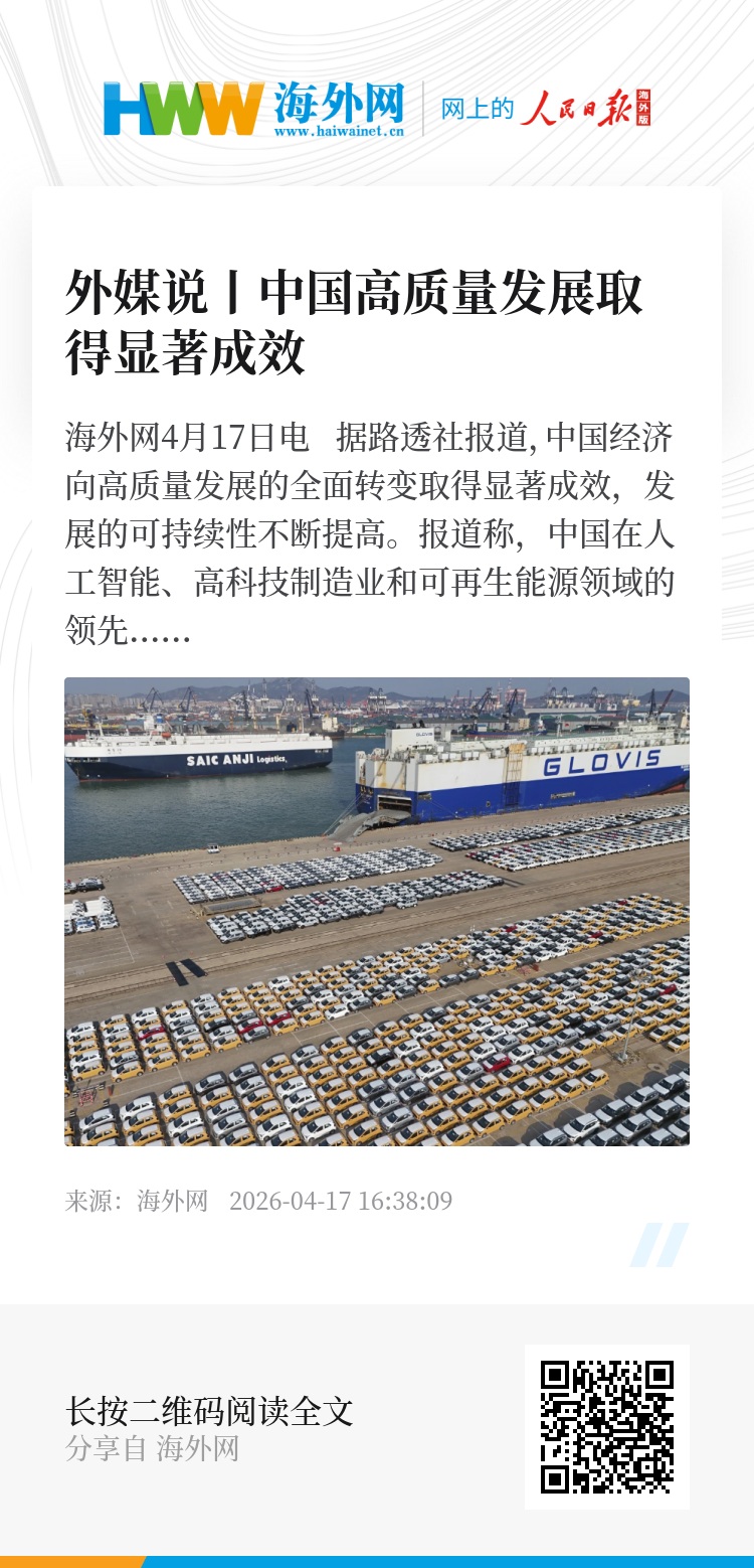海外网4月17日电 据路透社报道,中国经济向高质量发展的全面转变取得显著成效,发展的可持续性不断提高。