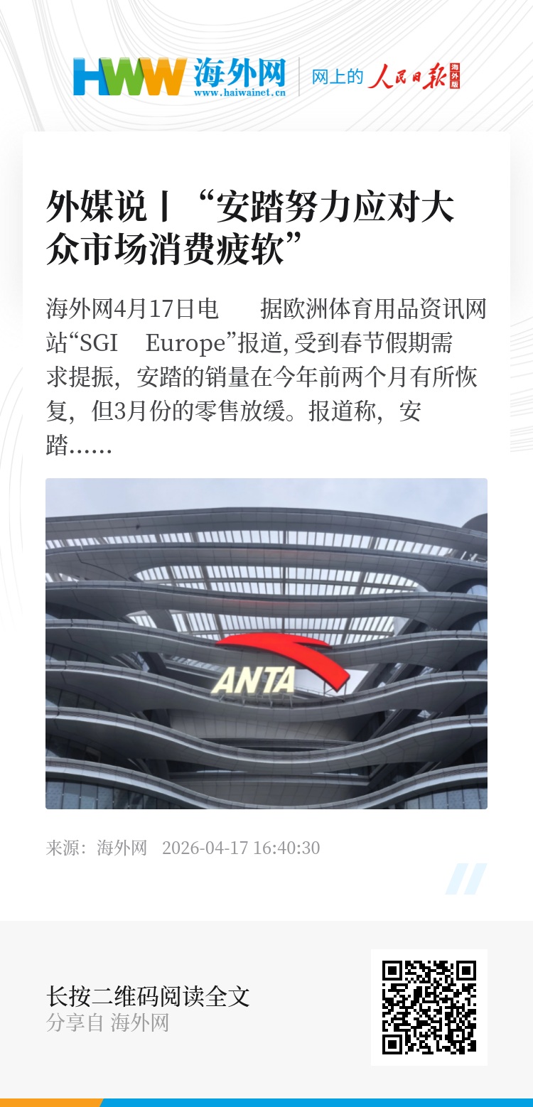海外网4月17日电 据欧洲体育用品资讯网站“SGI Europe”报道,受到春节假期需求提振,安踏的销量在今年前两个月有所恢复,但3月份的零售放缓。