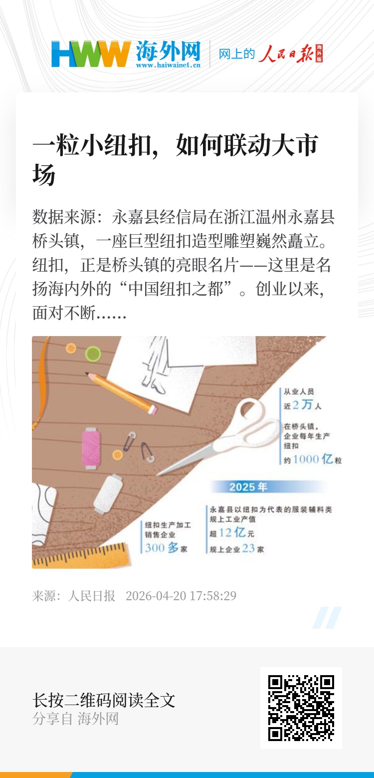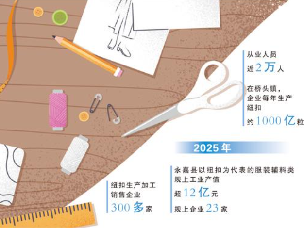 2025年,永嘉县以纽扣为代表的服装辅料类规上工业产值超12亿元,规上企业23家,纽扣生产加工销售企业300多家,从业人员近2万人。在桥头镇,企业每年大约生产纽扣1000亿粒。