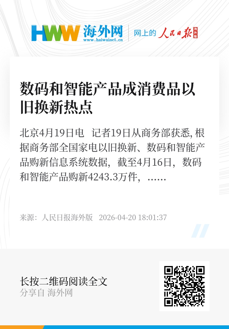 新华社北京4月19日电 记者19日从商务部获悉,根据商务部全国家电以旧换新、数码和智能产品购新信息系统数据,截至4月16日,数码和智能产品购新4243.3万件,同比增长31.7%;销售额1261.53亿元,同比增长36.4%。其中,手机销售占比超八成,呈现“中高端扩容、消费结构优化”态势。