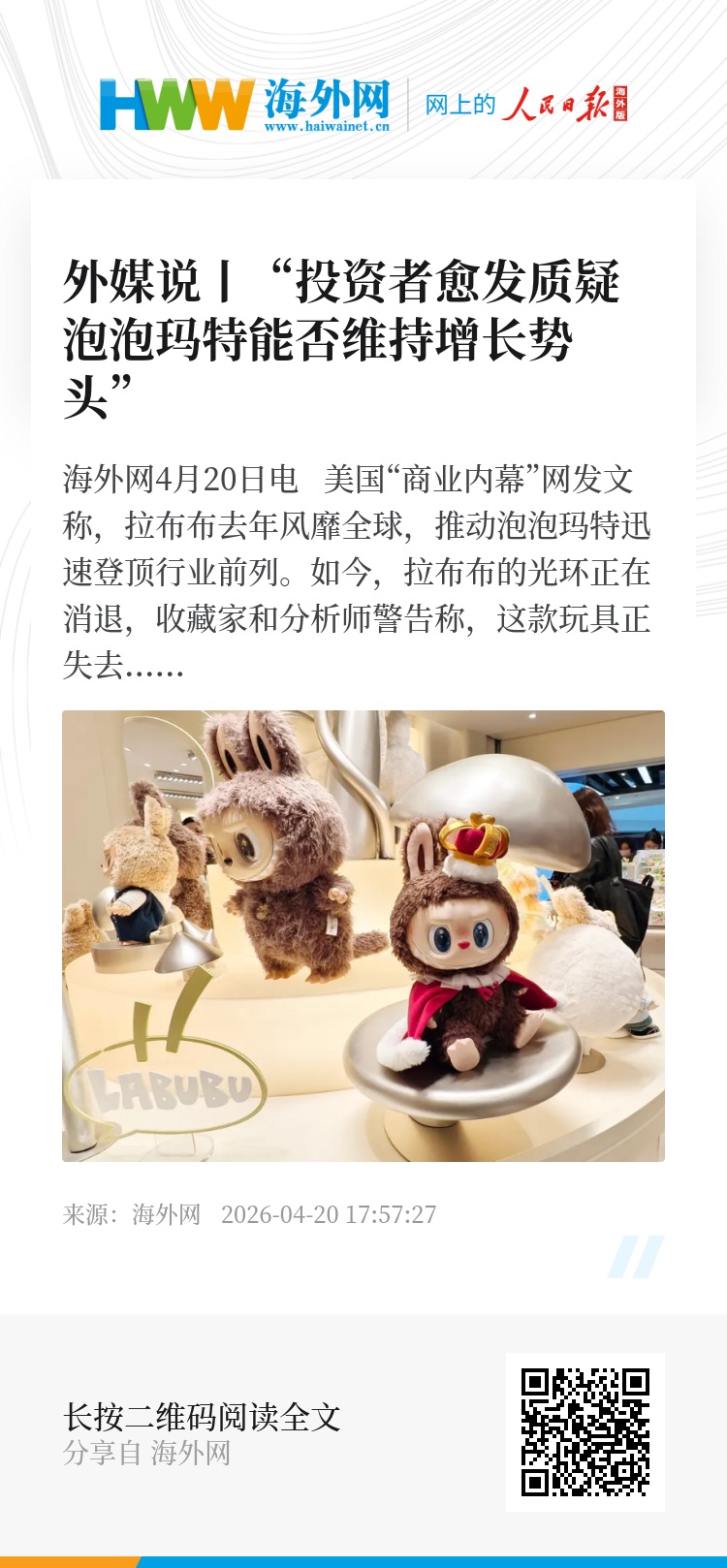 海外网4月20日电 美国“商业内幕”网发文称,拉布布去年风靡全球,推动泡泡玛特迅速登顶行业前列。如今,拉布布的光环正在消退,收藏家和分析师警告称,这款玩具正失去稀缺性。围绕拉布布的社交媒体热度已经下降,泡泡玛特的股价也受到了冲击。