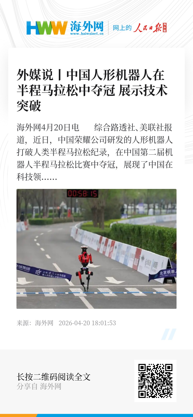 海外网4月20日电 综合路透社、美联社报道,近日,中国荣耀公司研发的人形机器人打破人类半程马拉松纪录,在中国第二届机器人半程马拉松比赛中夺冠,展现了中国在科技领域的飞跃。
