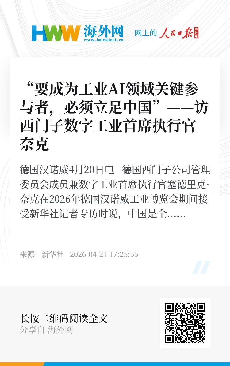 新华社德国汉诺威4月20日电 德国西门子公司管理委员会成员兼数字工业首席执行官塞德里克·奈克在2026年德国汉诺威工业博览会期间接受新华社记者专访时说,中国是全球人工智能(AI)领域的领导者之一,在开发和应用方面推进迅速,中国还拥有全球最大的制造业市场和全球最完整的工业价值链之一。要想成为工业AI领域的关键参与者,就必须立足中国。