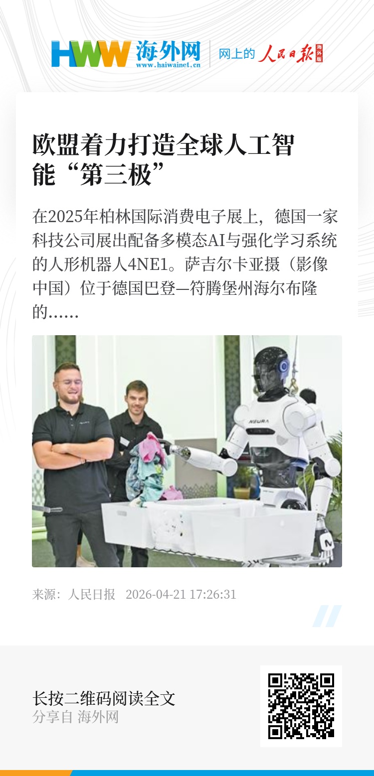 专家认为,未来5—10年,欧盟人工智能产业将呈现四大趋势:从“重伦理”向“伦理与产业并重”转型;从“科研主导”向“产业主导”转型;从“分散创新”向“跨国集群化创新”转型;从“本土竞争”向“全球合作”转型。不少学者认为,欧盟若能在制度优势、算力体系和产业体系之间形成真正合力,有望构建全球人工智能的“第三极”,在未来国际竞争中占据有利位置。(记者 牛瑞飞)