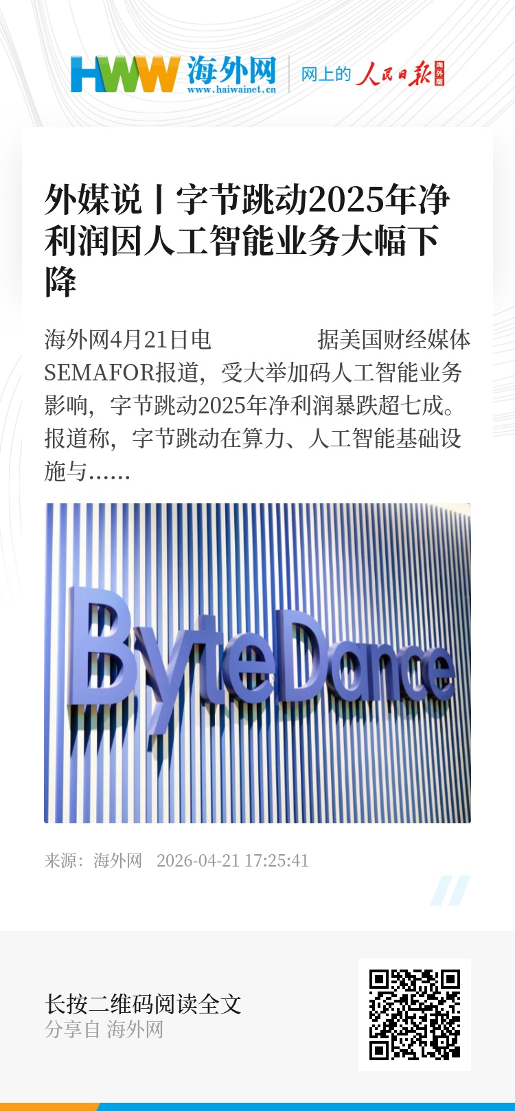 海外网4月21日电 据美国财经媒体SEMAFOR报道,受大举加码人工智能业务影响,字节跳动2025年净利润暴跌超七成。