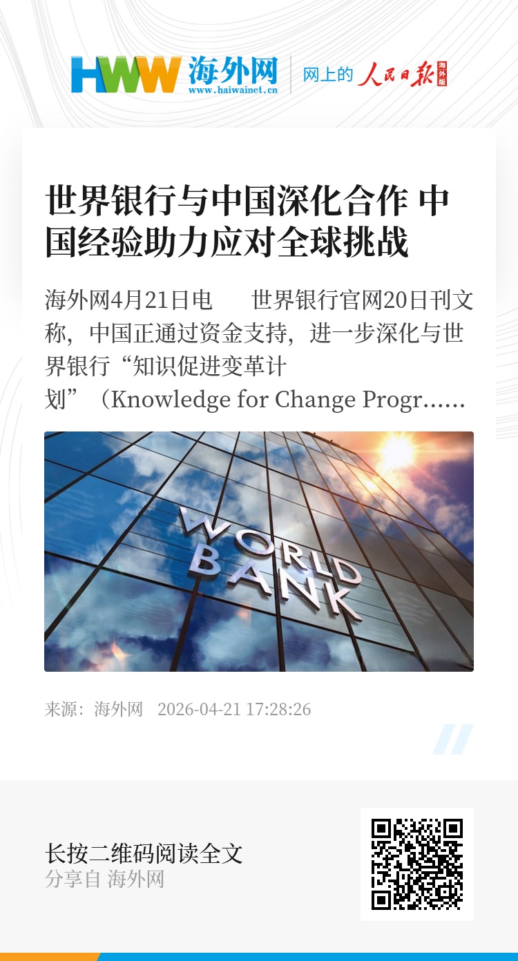 海外网4月21日电 世界银行官网20日刊文称,中国正通过资金支持,进一步深化与世界银行“知识促进变革计划”(Knowledge for Change Program, KCP)的合作。