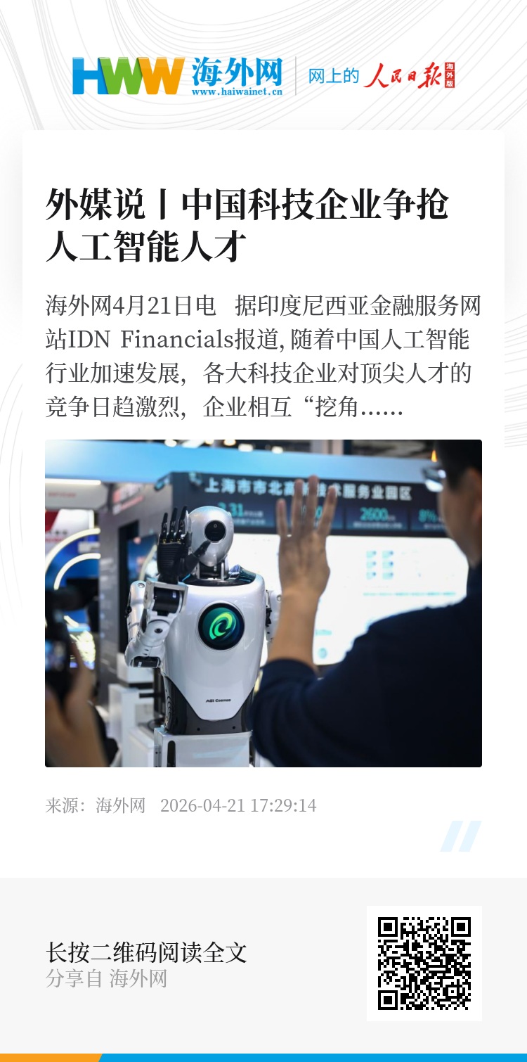 海外网4月21日电 据印度尼西亚金融服务网站IDN Financials报道,随着中国人工智能行业加速发展,各大科技企业对顶尖人才的竞争日趋激烈,企业相互“挖角”的同时,也积极吸引海外科创中心的科研人才。