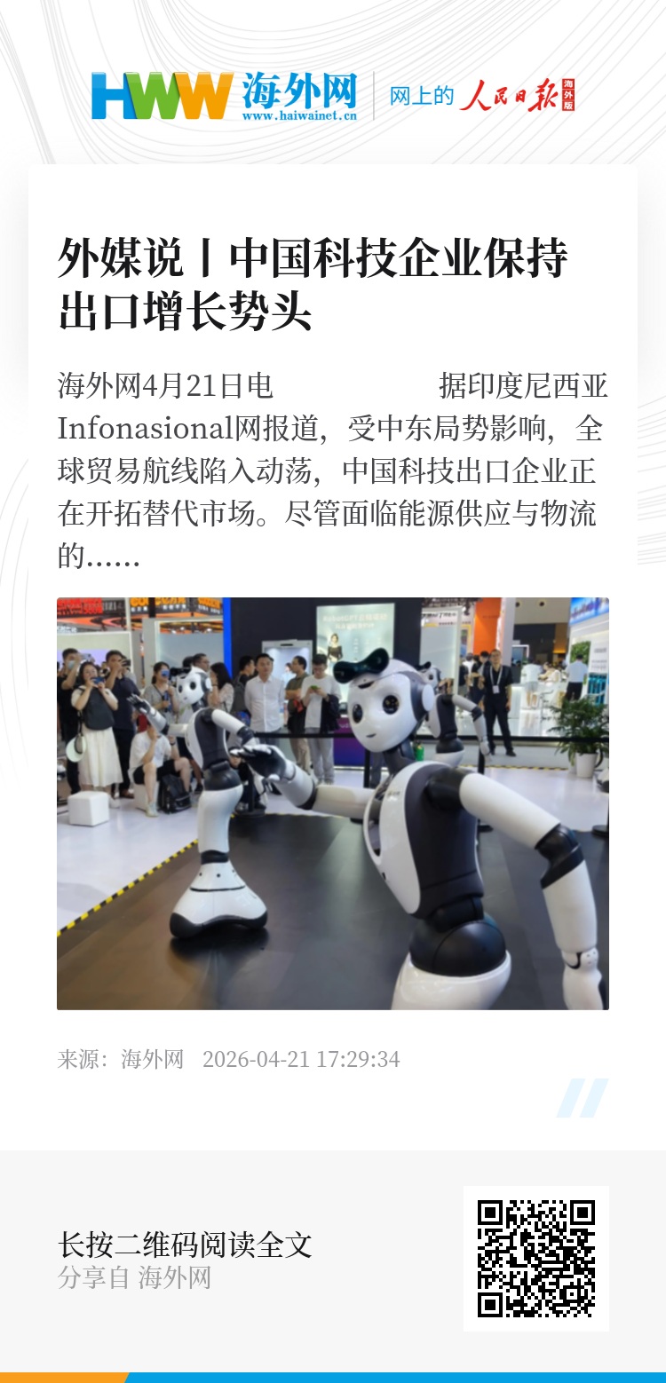 海外网4月21日电 据印度尼西亚Infonasional网报道,受中东局势影响,全球贸易航线陷入动荡,中国科技出口企业正在开拓替代市场。尽管面临能源供应与物流的中断,一批创新型企业正凭借先进技术,稳住出口增长势头。据报道,波兰一名园林机械采购商表示,“相比其他地区,我们更倾向采购中国产品,品质更优且性价比突出。”这一观点充分体现了中国在中高端制造领域的核心竞争优势。