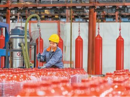 在江西省瑞昌经开区一家企业车间内,工人赶制钢质无缝气瓶产品。
