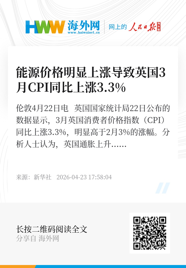 新华社伦敦4月22日电 英国国家统计局22日公布的数据显示,3月英国消费者价格指数(CPI)同比上涨3.3%,明显高于2月3%的涨幅。分析人士认为,英国通胀上升的原因主要是中东战事导致能源供应受阻及能源价格跳涨。