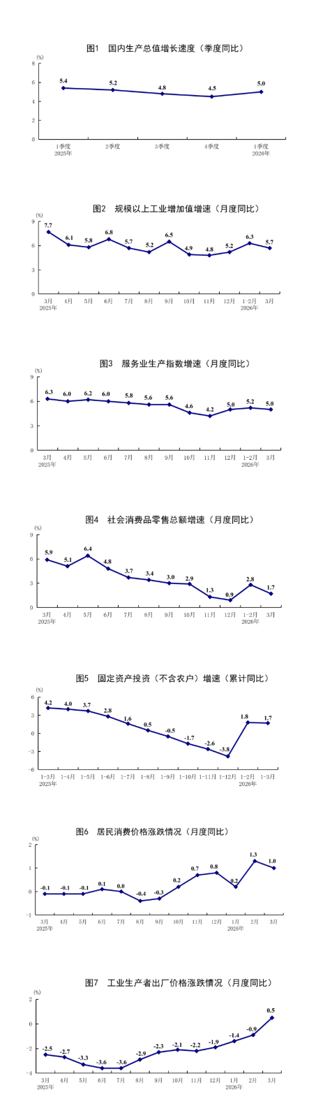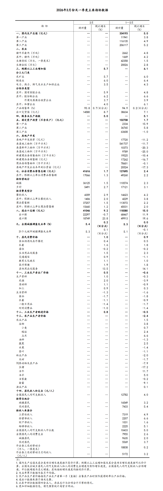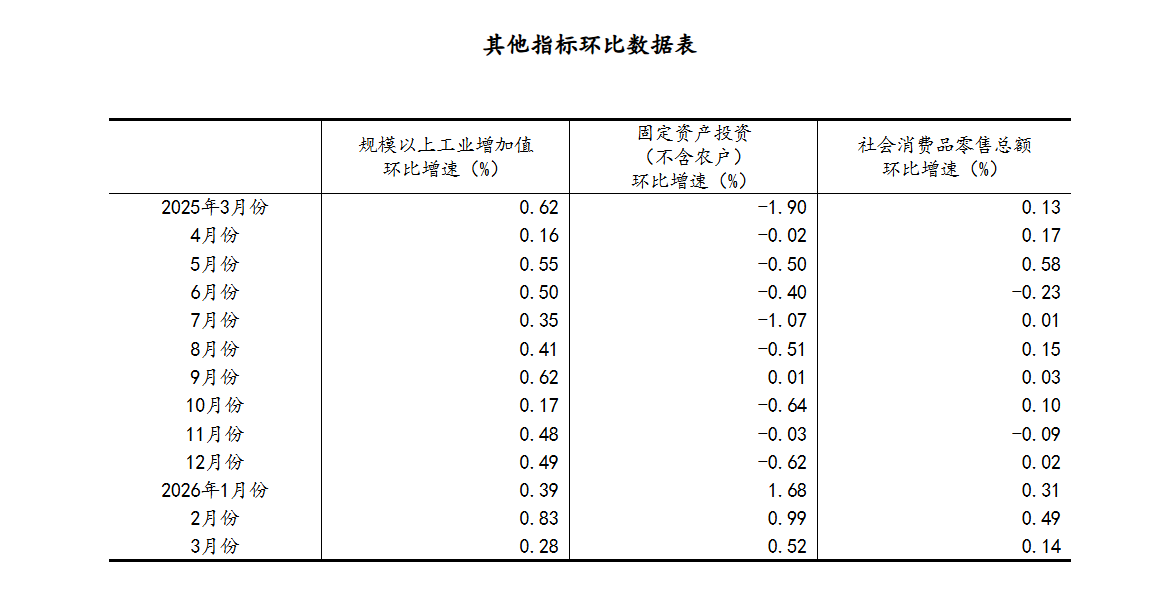 (2)根据季节调整模型自动修正结果,对近一年来各期国内生产总值、规模以上工业增加值、固定资产投资(不含农户)、社会消费品零售总额环比增速进行修订。修订结果及2026年一季度GDP环比数据、2026年3月份其他指标环比数据如下: