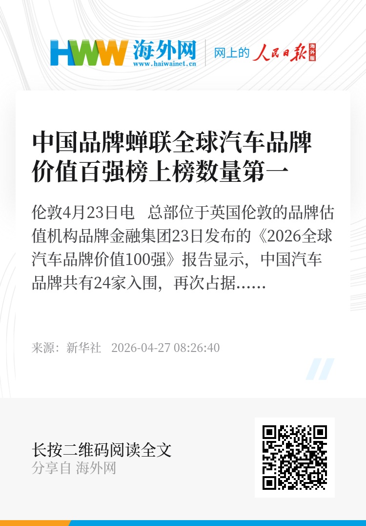 新华社伦敦4月23日电 总部位于英国伦敦的品牌估值机构品牌金融集团23日发布的《2026全球汽车品牌价值100强》报告显示,中国汽车品牌共有24家入围,再次占据上榜数量首位。