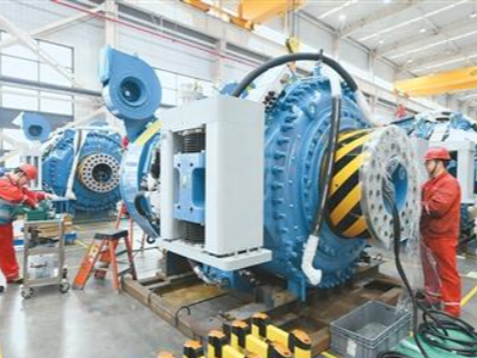 4月22日,在安徽省阜阳市阜合产业园内,某企业工人在车间进行风力发电设备零部件安装作业。