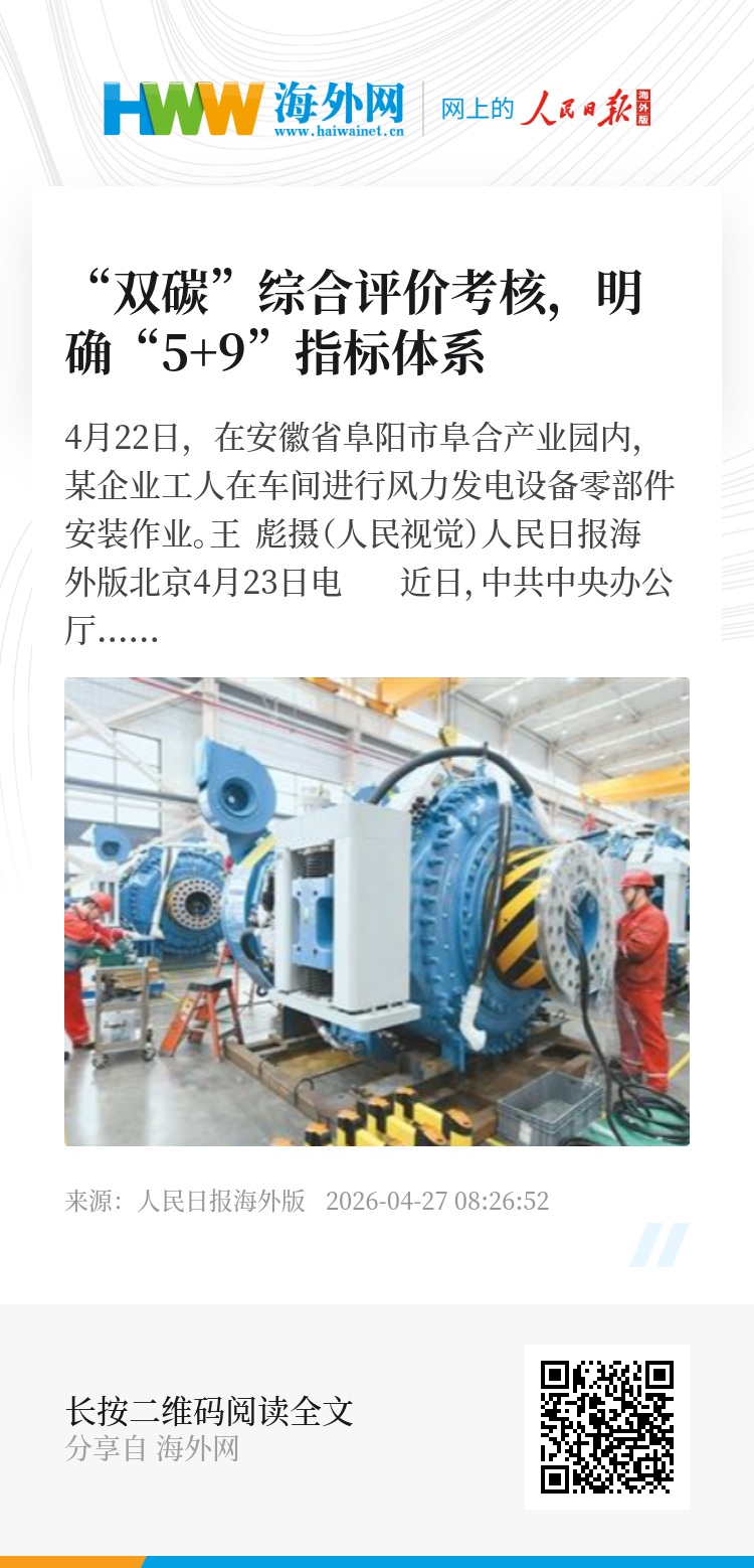 人民日报海外版北京4月23日电 近日,中共中央办公厅、国务院办公厅印发《碳达峰碳中和综合评价考核办法》(以下简称《办法》)。国家发展改革委有关负责人表示,《办法》作为碳排放双控制度体系的关键制度,正式将碳排放双控要求纳入党内法规体系,将有力督促地方党委和政府坚决扛起碳达峰碳中和责任、抓好工作落实,确保如期实现“双碳”目标。