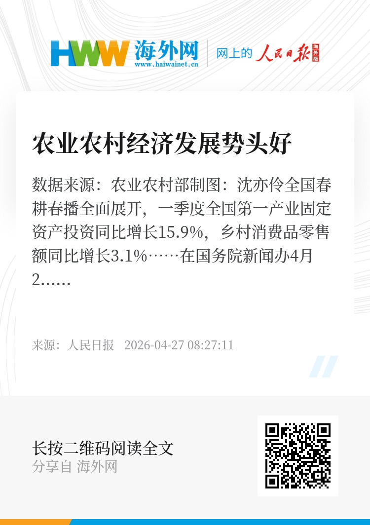 全国春耕春播全面展开,一季度全国第一产业固定资产投资同比增长15.9%,乡村消费品零售额同比增长3.1%……在国务院新闻办4月23日举行的新闻发布会上,农业农村部副部长麦尔丹·木盖提在介绍一季度“三农”形势时表示,农业农村经济保持良好发展势头。