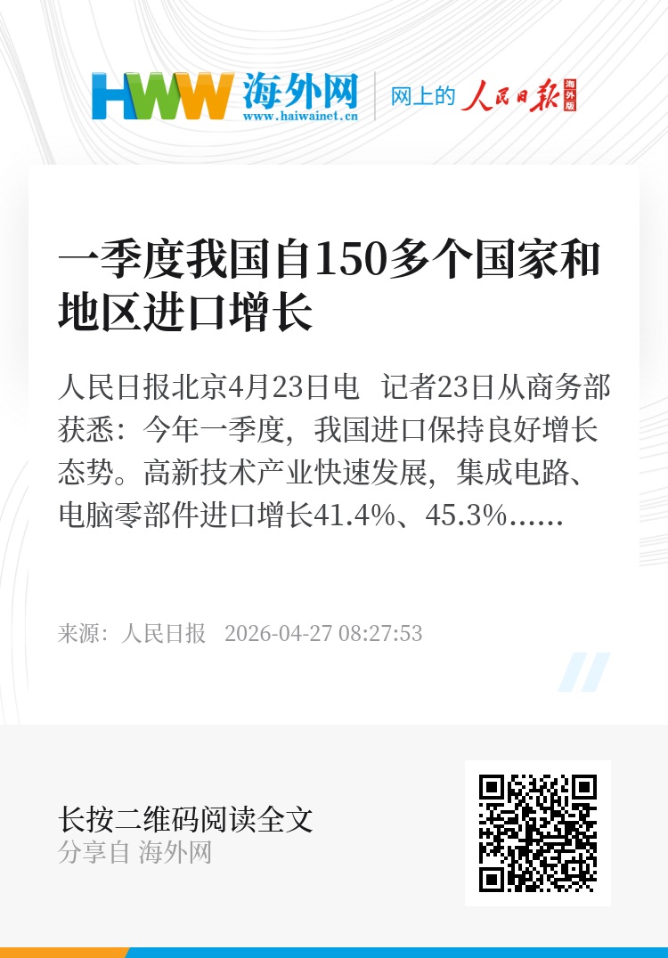 人民日报北京4月23日电 记者23日从商务部获悉:今年一季度,我国进口保持良好增长态势。高新技术产业快速发展,集成电路、电脑零部件进口增长41.4%、45.3%。大宗商品进口保持增长,原油、铁矿砂、粮食分别增长8.9%、10.5%、11.2%。