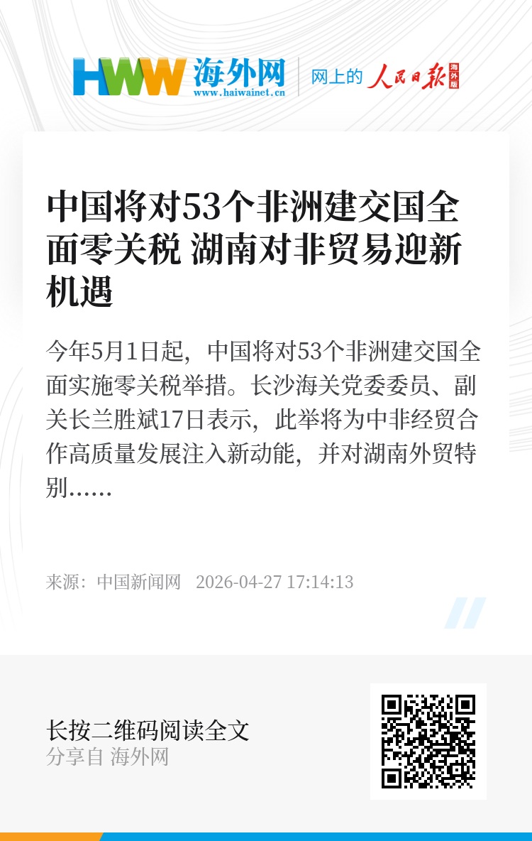 今年5月1日起,中国将对53个非洲建交国全面实施零关税举措。长沙海关党委委员、副关长兰胜斌17日表示,此举将为中非经贸合作高质量发展注入新动能,并对湖南外贸特别是中非经贸深度合作先行区建设产生积极影响。