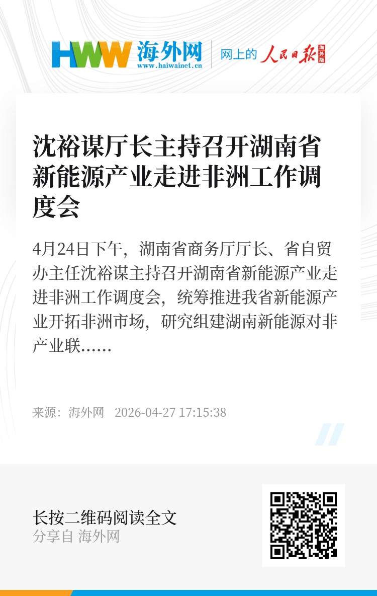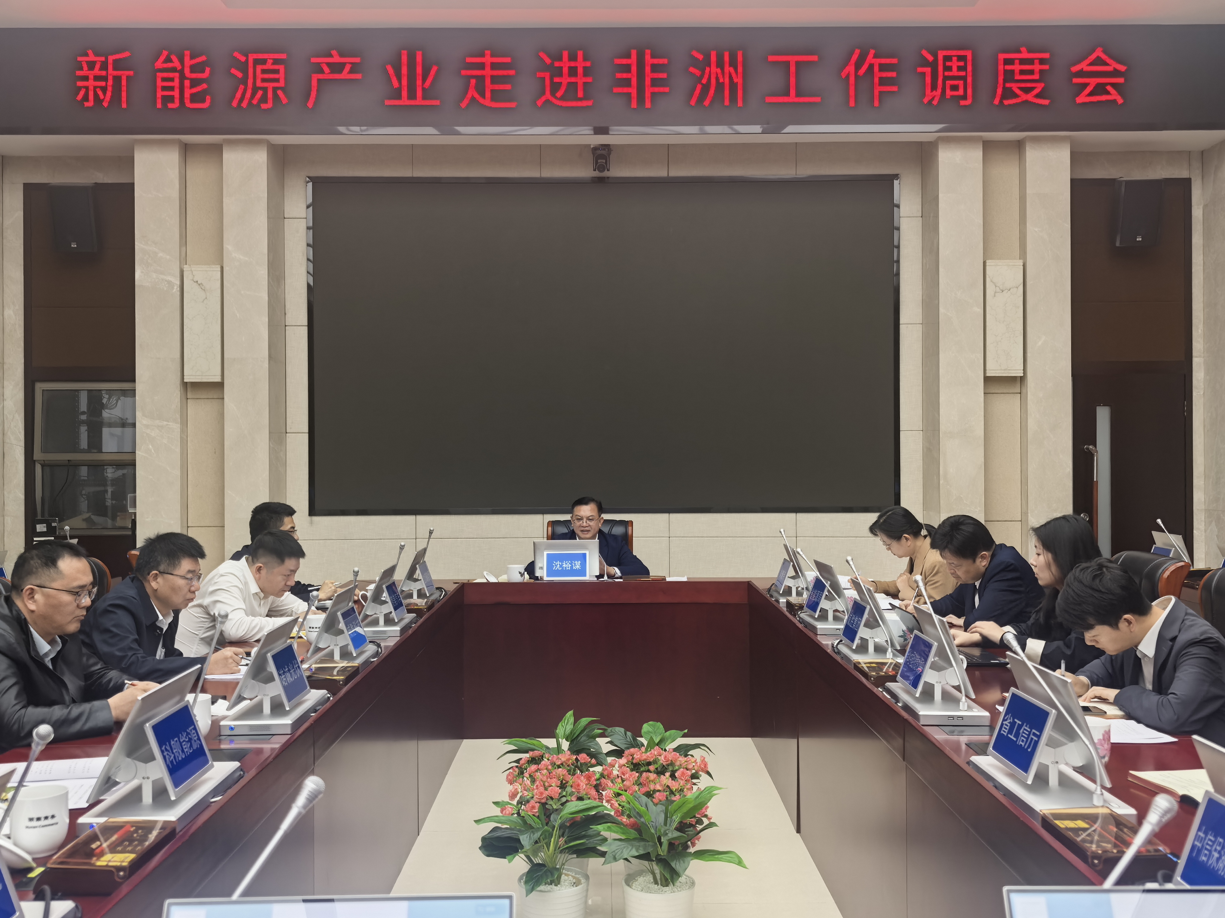4月24日下午,湖南省商务厅厅长、省自贸办主任沈裕谋主持召开湖南省新能源产业走进非洲工作调度会,统筹推进我省新能源产业开拓非洲市场,研究组建湖南新能源对非产业联盟,刘素月副厅长出席会议。省能源局、省工信厅等部门,威胜信息、赞美汽车、诺诚光伏、红太阳新能源、科舰能源、三一硅能、中车时代电汽、华自科技、中能建湖南电力设计院、裕能新能源等企业,新华社、中信保、交行、工行等机构代表参会。