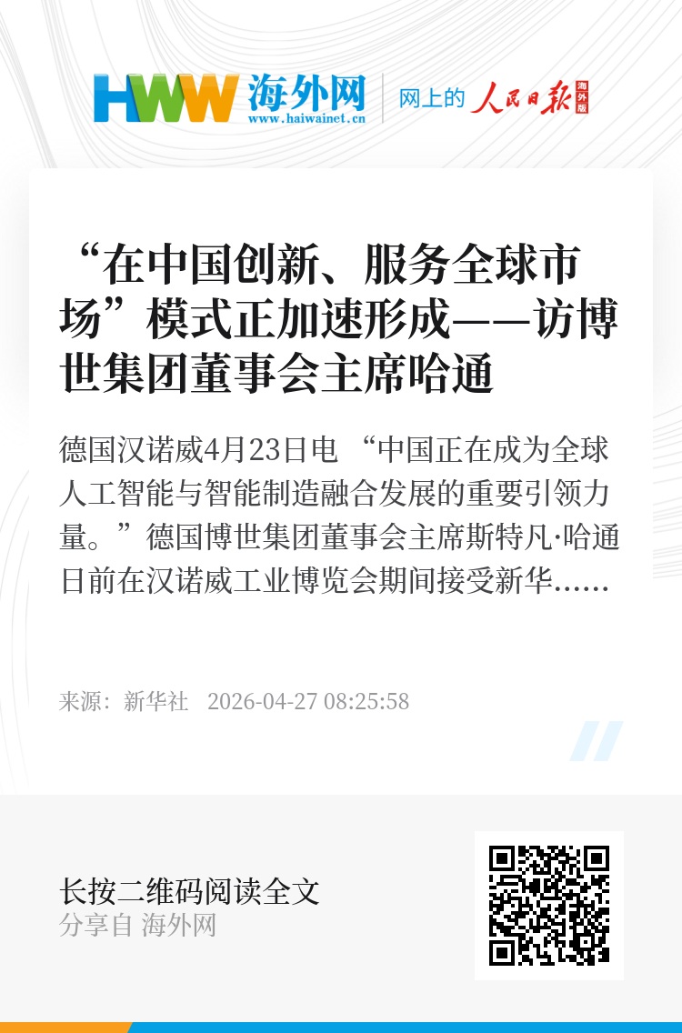 新华社德国汉诺威4月23日电 “中国正在成为全球人工智能与智能制造融合发展的重要引领力量。”德国博世集团董事会主席斯特凡·哈通日前在汉诺威工业博览会期间接受新华社记者专访时表示,在全球产业加速迈向智能化的进程中,中国凭借超大规模市场、完整产业体系、丰富应用场景以及持续增强的技术创新能力,正不断推动人工智能在制造业中的深度落地,并为全球工业转型提供重要示范与动力。企业依托中国创新,服务全球市场的模式正在加速形成。