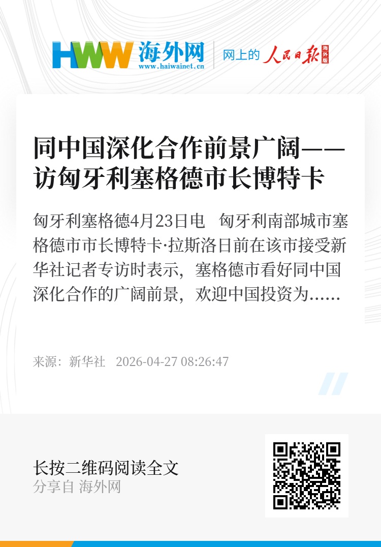 新华社匈牙利塞格德4月23日电 匈牙利南部城市塞格德市市长博特卡·拉斯洛日前在该市接受新华社记者专访时表示,塞格德市看好同中国深化合作的广阔前景,欢迎中国投资为当地带来发展机遇。