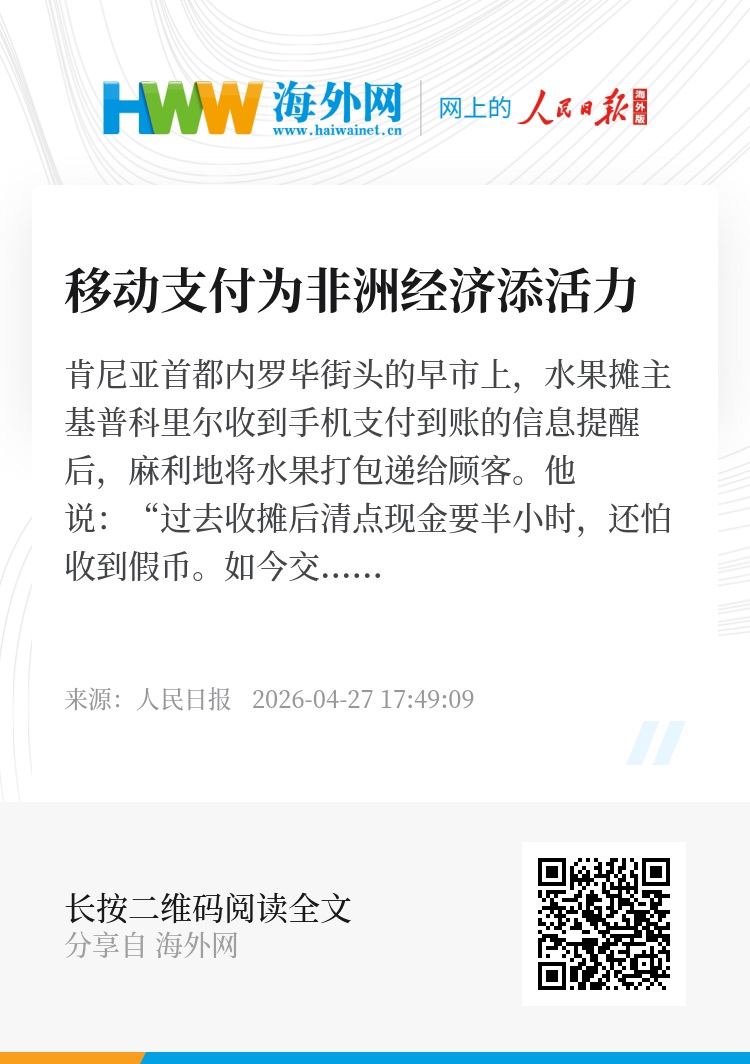 肯尼亚首都内罗毕街头的早市上,水果摊主基普科里尔收到手机支付到账的信息提醒后,麻利地将水果打包递给顾客。他说:“过去收摊后清点现金要半小时,还怕收到假币。如今交易记录清晰可查,省了不少麻烦。”