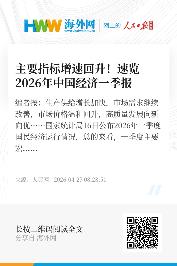 编者按:生产供给增长加快,市场需求继续改善,市场价格温和回升,高质量发展向新向优……国家统计局16日公布2026年一季度国民经济运行情况,总的来看,一季度主要宏观指标增速回升,新动能快速成长,国民经济实现良好开局。