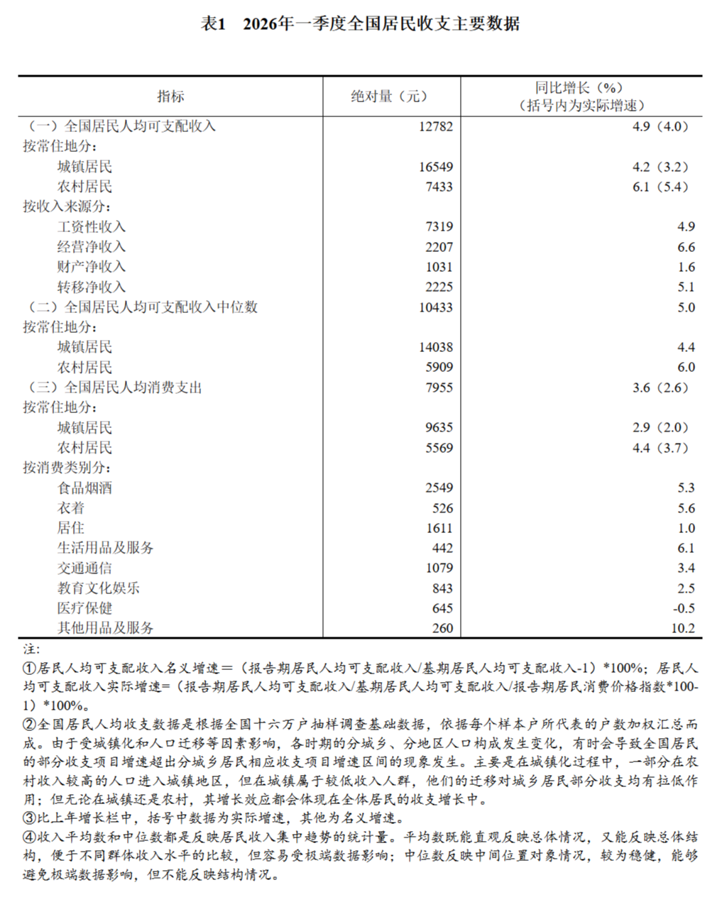 图1 2026年一季度全国及分城乡居民人均可支配收入
