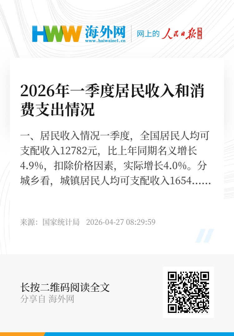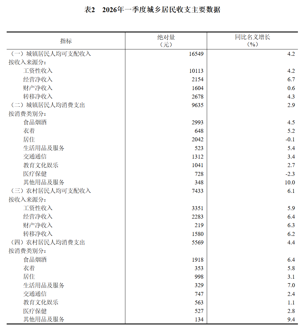 一季度,全国居民人均可支配收入12782元,比上年同期名义增长4.9%,扣除价格因素,实际增长4.0%。分城乡看,城镇居民人均可支配收入16549元,增长(以下如无特别说明,均为同比名义增长)4.2%,扣除价格因素,实际增长3.2%;农村居民人均可支配收入7433元,增长6.1%,扣除价格因素,实际增长5.4%。