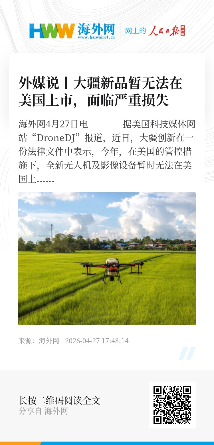 大疆认为,管控措施公布后,已对企业造成直接且严重的损害。在美国市场,大疆是知名度较高的无人机品牌,广泛服务于业余爱好者、影视创作者、测绘人员、农业从业者、巡检人员及公共安全部门等。这意味着,此次管控事件的影响,早已超出单一企业范畴。若限制措施长期存在,美国消费者将面临大疆新品供给缩减、行业竞争弱化、无人机市场整体售价上涨等问题。(海外网 李芳)