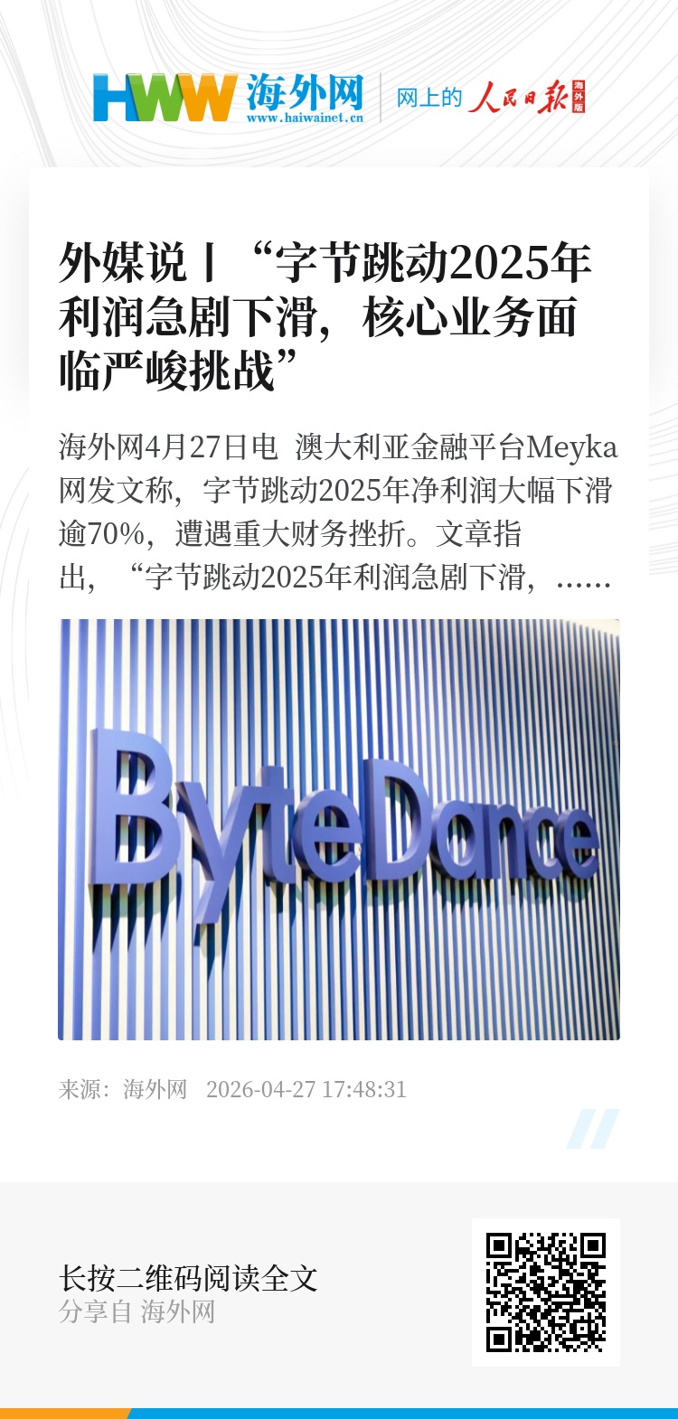 海外网4月27日电 澳大利亚金融平台Meyka网发文称,字节跳动2025年净利润大幅下滑逾70%,遭遇重大财务挫折。