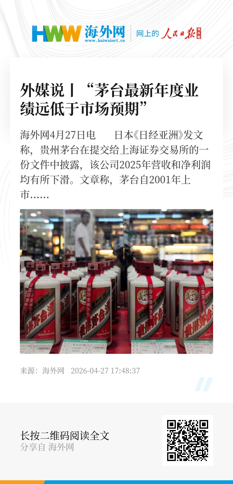 海外网4月27日电 日本《日经亚洲》发文称,贵州茅台在提交给上海证券交易所的一份文件中披露,该公司2025年营收和净利润均有所下滑。