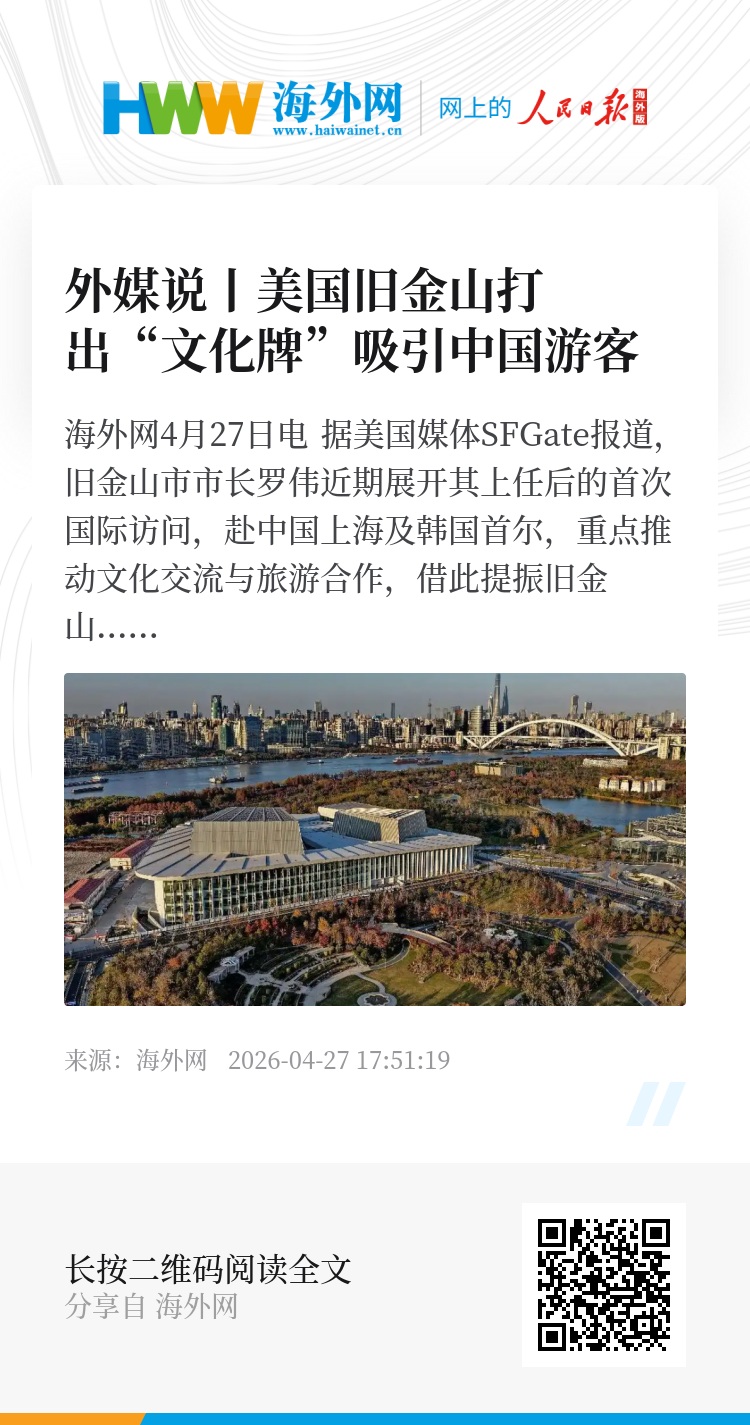 海外网4月27日电 据美国媒体SFGate报道,旧金山市市长罗伟近期展开其上任后的首次国际访问,赴中国上海及韩国首尔,重点推动文化交流与旅游合作,借此提振旧金山市旅游经济。
