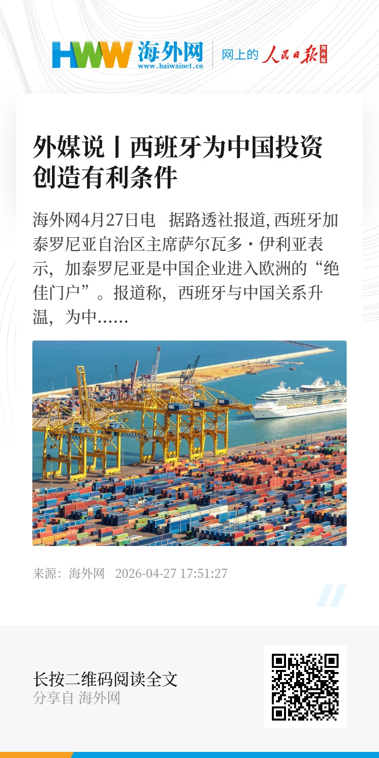 海外网4月27日电 据路透社报道,西班牙加泰罗尼亚自治区主席萨尔瓦多・伊利亚表示,加泰罗尼亚是中国企业进入欧洲的“绝佳门户”。