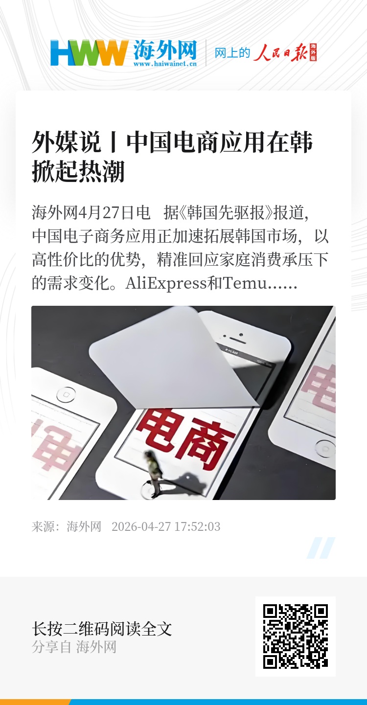 报道指出,业内人士分析称,随着家庭预算减少,韩国消费者的消费模式转向更为务实、更注重性价比的消费,价格已成为决策的核心因素。这促使越来越多用户选择性价比突出的中国电商应用。韩国移动应用数据分析机构WiseApp Retail的数据显示,中国在线时尚平台Shein今年1月在20至30岁用户群体中的数量较去年同期增长近三倍。与此同时,中国平台也成为连接韩国电商生态与更广阔全球市场的渠道。报道指出,韩国品牌正持续加强与中国电商应用的合作,借此拓展跨境销售与全球物流网络。(石雯欣)