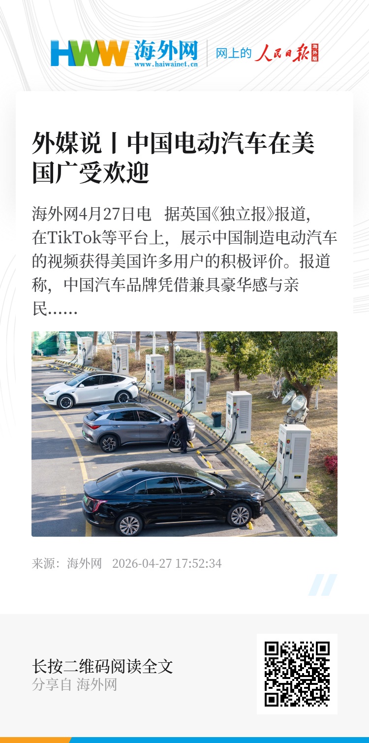 海外网4月27日电 据英国《独立报》报道,在TikTok等平台上,展示中国制造电动汽车的视频获得美国许多用户的积极评价。