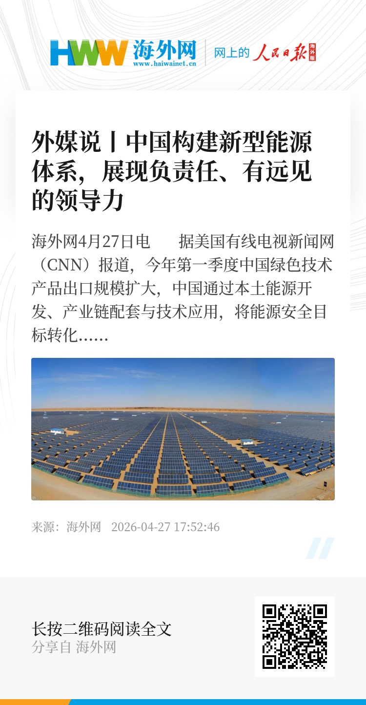 海外网4月27日电 据美国有线电视新闻网(CNN)报道,今年第一季度中国绿色技术产品出口规模扩大,中国通过本土能源开发、产业链配套与技术应用,将能源安全目标转化为产业实践,展现出负责任、有远见的领导力,受到世界各国关注。