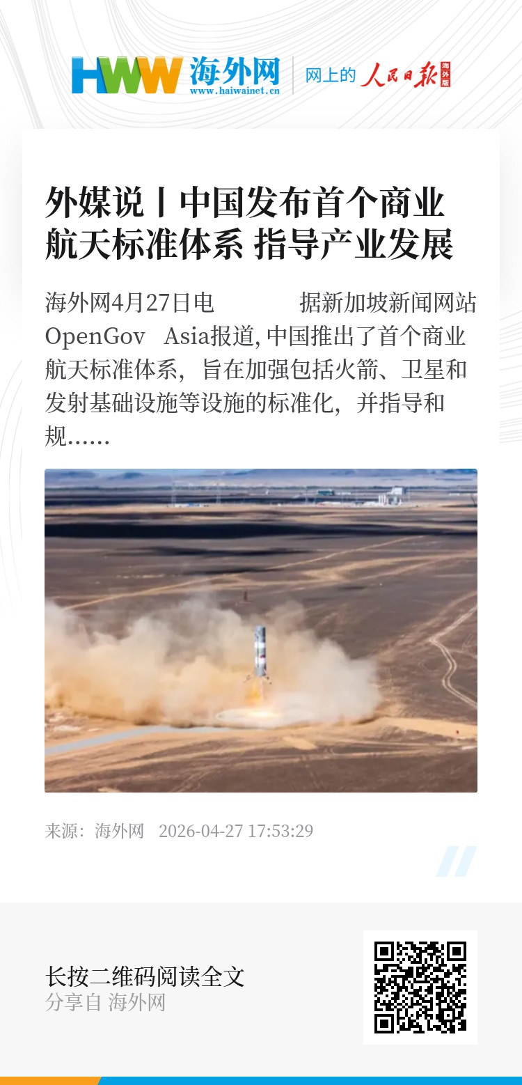 海外网4月27日电 据新加坡新闻网站OpenGov Asia报道,中国推出了首个商业航天标准体系,旨在加强包括火箭、卫星和发射基础设施等设施的标准化,并指导和规范航天领域,支持商业航天活动的高质量、协调发展。