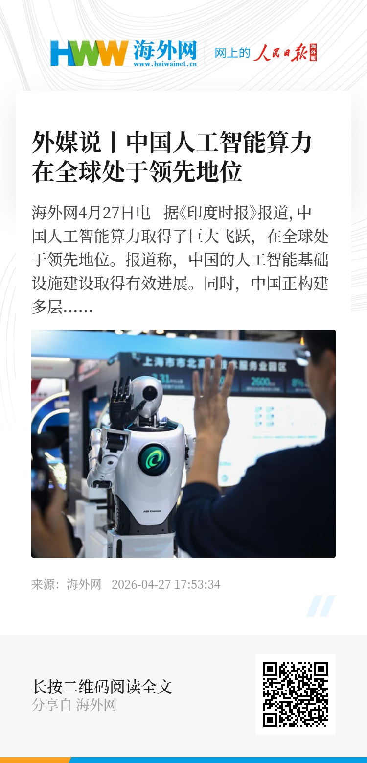 海外网4月27日电 据《印度时报》报道,中国人工智能算力取得了巨大飞跃,在全球处于领先地位。