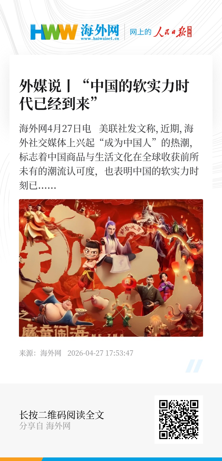 海外网4月27日电 美联社发文称,近期,海外社交媒体上兴起“成为中国人”的热潮,标志着中国商品与生活文化在全球收获前所未有的潮流认可度,也表明中国的软实力时刻已经到来。