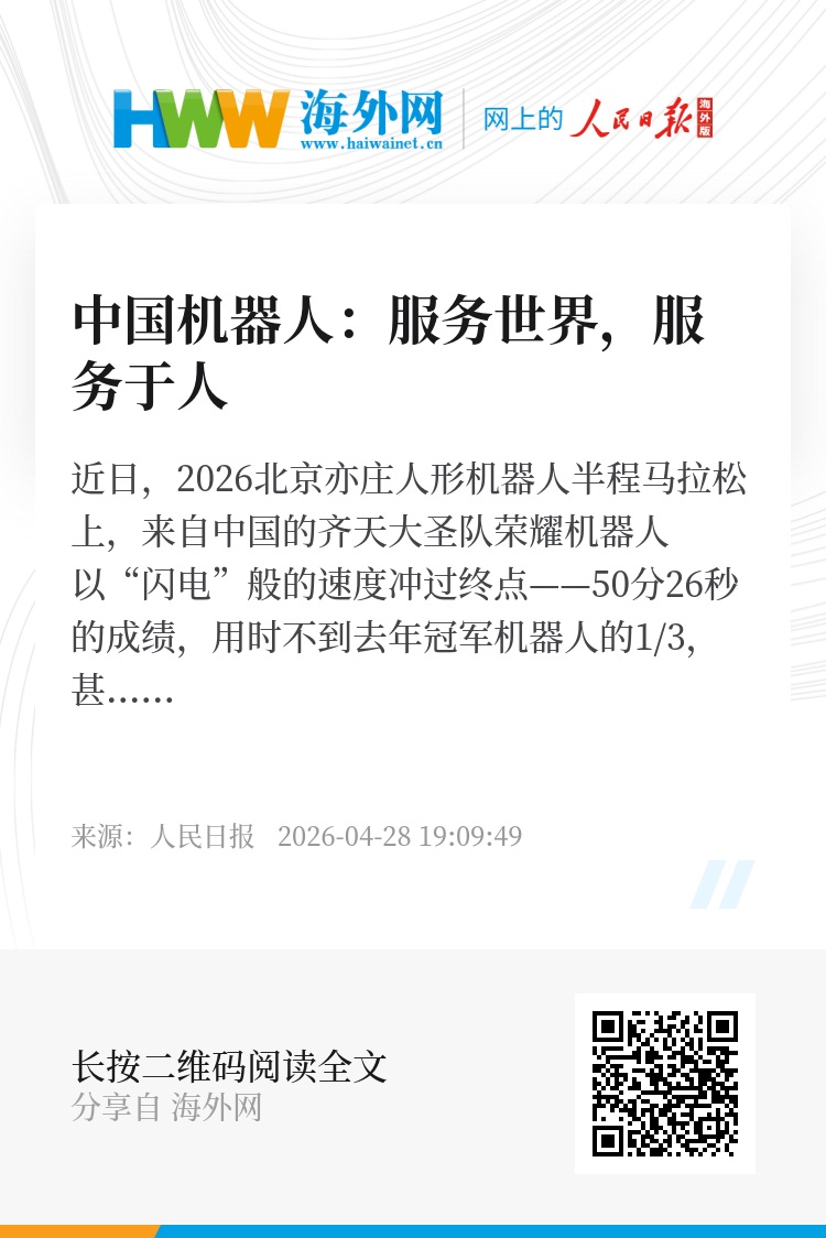 近日,2026北京亦庄人形机器人半程马拉松上,来自中国的齐天大圣队荣耀机器人以“闪电”般的速度冲过终点——50分26秒的成绩,用时不到去年冠军机器人的1/3,甚至超越了人类男子半马世界纪录。外媒记者一路跟拍,惊呼不断。美国全国广播公司直呼“像科幻电影”。韩国YTN电视台感慨:“中国机器人技术进步的速度,与机器人奔跑的速度一样迅猛。”