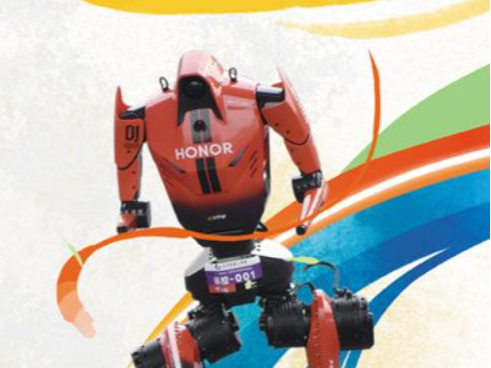 4月19日,参加2026北京亦庄人形机器人半程马拉松的自主人形机器人选手“闪电”在比赛中。