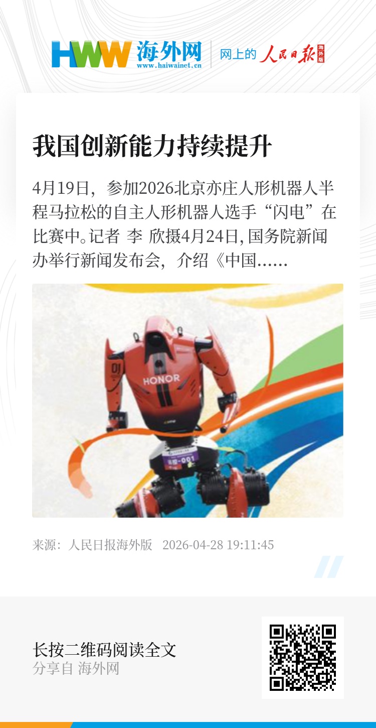 4月24日,国务院新闻办举行新闻发布会,介绍《中国打击侵权假冒工作年度报告(2025)》有关情况。市场监管总局副局长白清元表示,随着知识产权保护工作的不断强化,中国的创新能力持续提升。世界知识产权组织《2025年全球创新指数报告》显示,中国首次跻身全球前十,在全球中等收入经济体中保持领先地位。