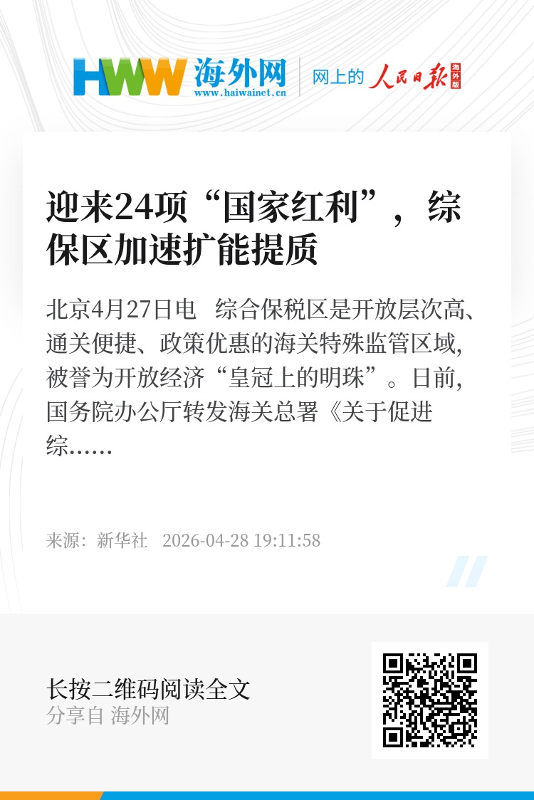 “十五五”规划纲要提出“促进综合保税区转型升级”。潘城表示,随着24项改革措施的落地实施,综合保税区将迎来新一轮发展机遇,承担更为重要的任务使命,为“十五五”时期我国进一步扩大高水平对外开放注入强劲动力。“欢迎广大外贸企业结合自身业务特点,用足用好综合保税区政策功能,不断提升企业和产品的竞争力。”他说。(记者 邹多为)