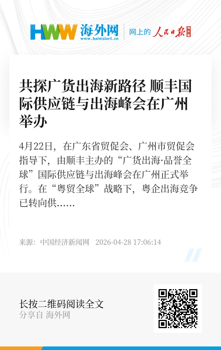 4月22日,在广东省贸促会、广州市贸促会指导下,由顺丰主办的“广货出海·品誉全球”国际供应链与出海峰会在广州正式举行。在“粤贸全球”战略下,粤企出海竞争已转向供应链、数字技术和品牌力的综合比拼。峰会紧扣企业出海痛点,围绕政策补贴、通关效率、海外布局及平台运营等议题,提供全场景端到端解决方案,为粤企破局解惑。