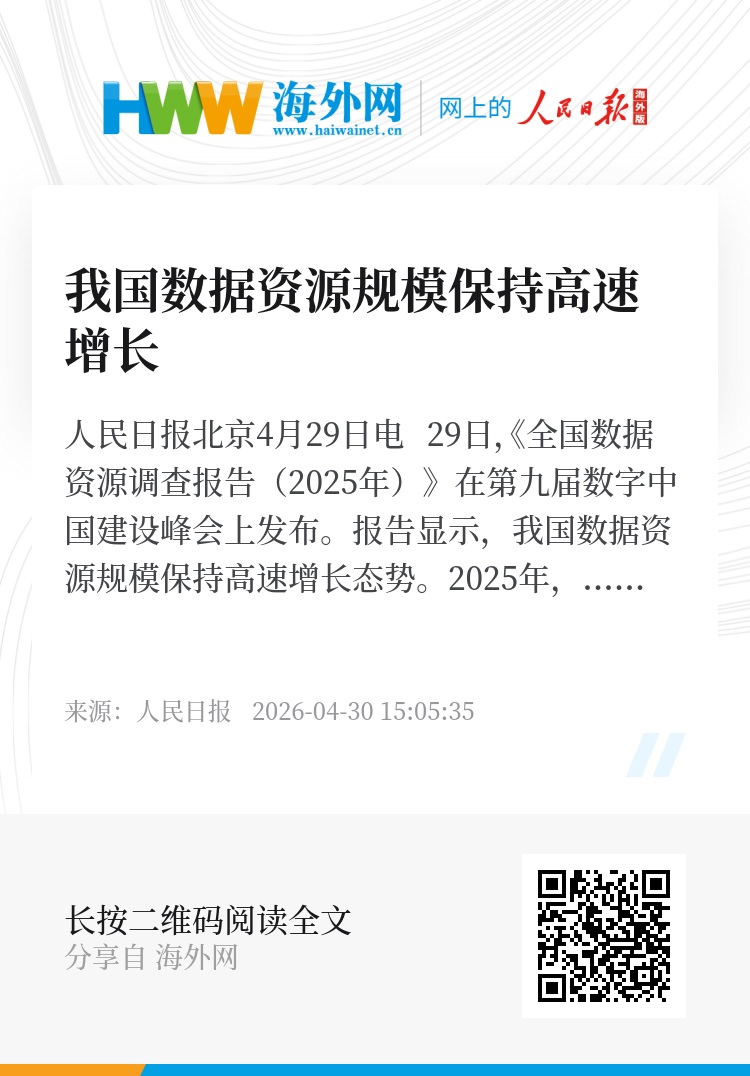 人民日报北京4月29日电 29日,《全国数据资源调查报告(2025年)》在第九届数字中国建设峰会上发布。报告显示,我国数据资源规模保持高速增长态势。2025年,全国年度数据生产总量达52.26ZB(泽字节),同比增长27.28%,增速较上年提升2.28个百分点。我国数据生产总量约占全球27.44%。